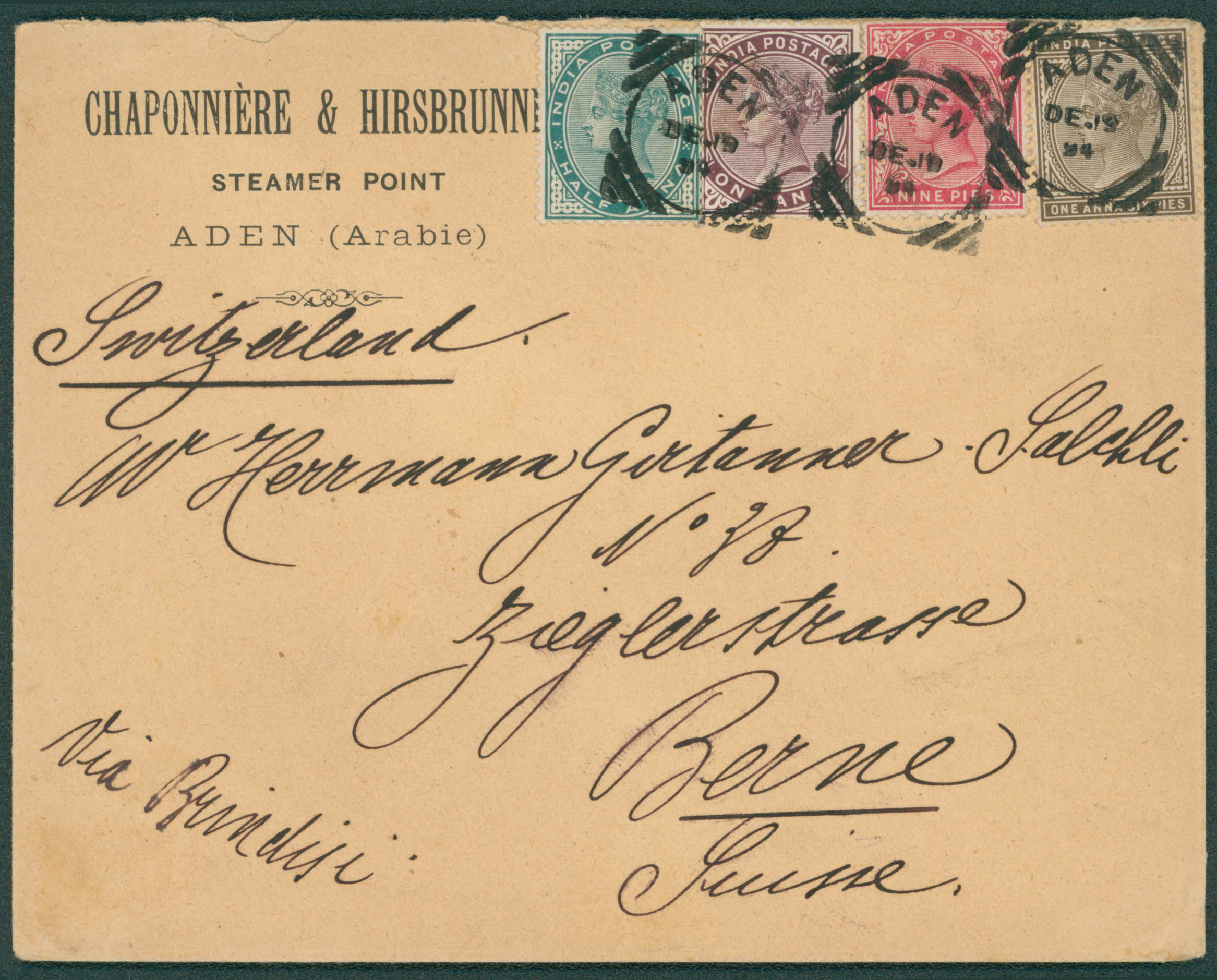 Aden - Inde Yv. 33/6, afft quadricolore, obl Aden 19/12/94 vers la Suisse. Càd arrivée Bern 30/12 au verso. TB et rare !!