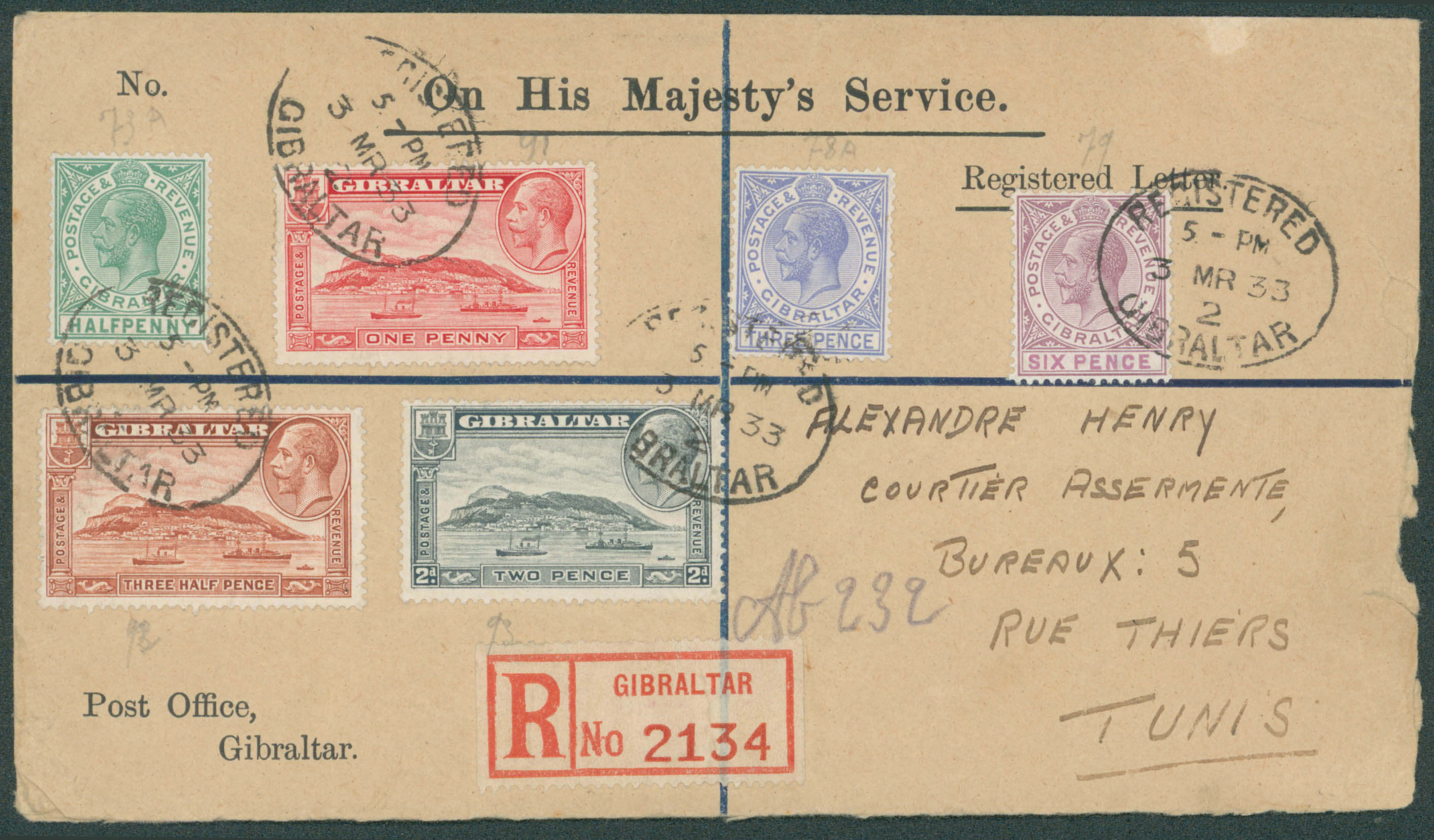 Gibraltar - Yv. 73A-78/9-91/3 obl 3/3/33 en rec vers Tunis via le Maroc, divers càd au verso.