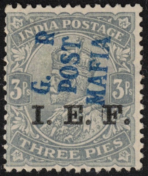 Tanganyika - Mafia Island, occupation britannique, Indian Expeditionary Forces - SG 33 avec G.R. Post Mafia appliqué manuellement latéralement en lisant de bas en haut sur 3p gris neuf, gomme d'origine. (SG M33, Scott NL 79, Greenwood 56b). Certificat photo Briefmarkenprüfstelle Basel. Cote Greenwood 6000?. Variété très rare !!