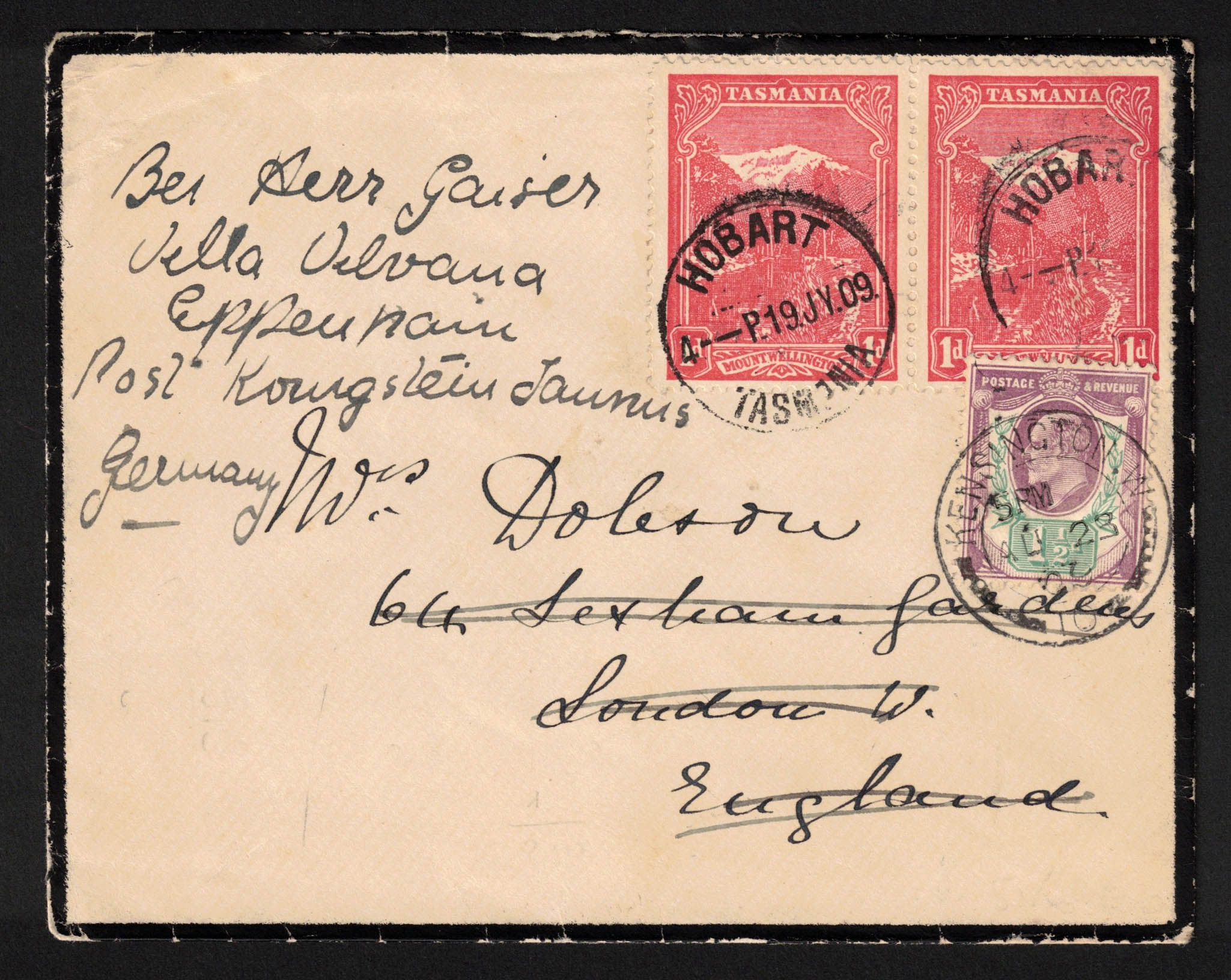 Tasmanie - Yv. 60x2 obl Hobart vers Londres, réexpédié par Yv. 108 obl Kensington vers l'Allemagne.