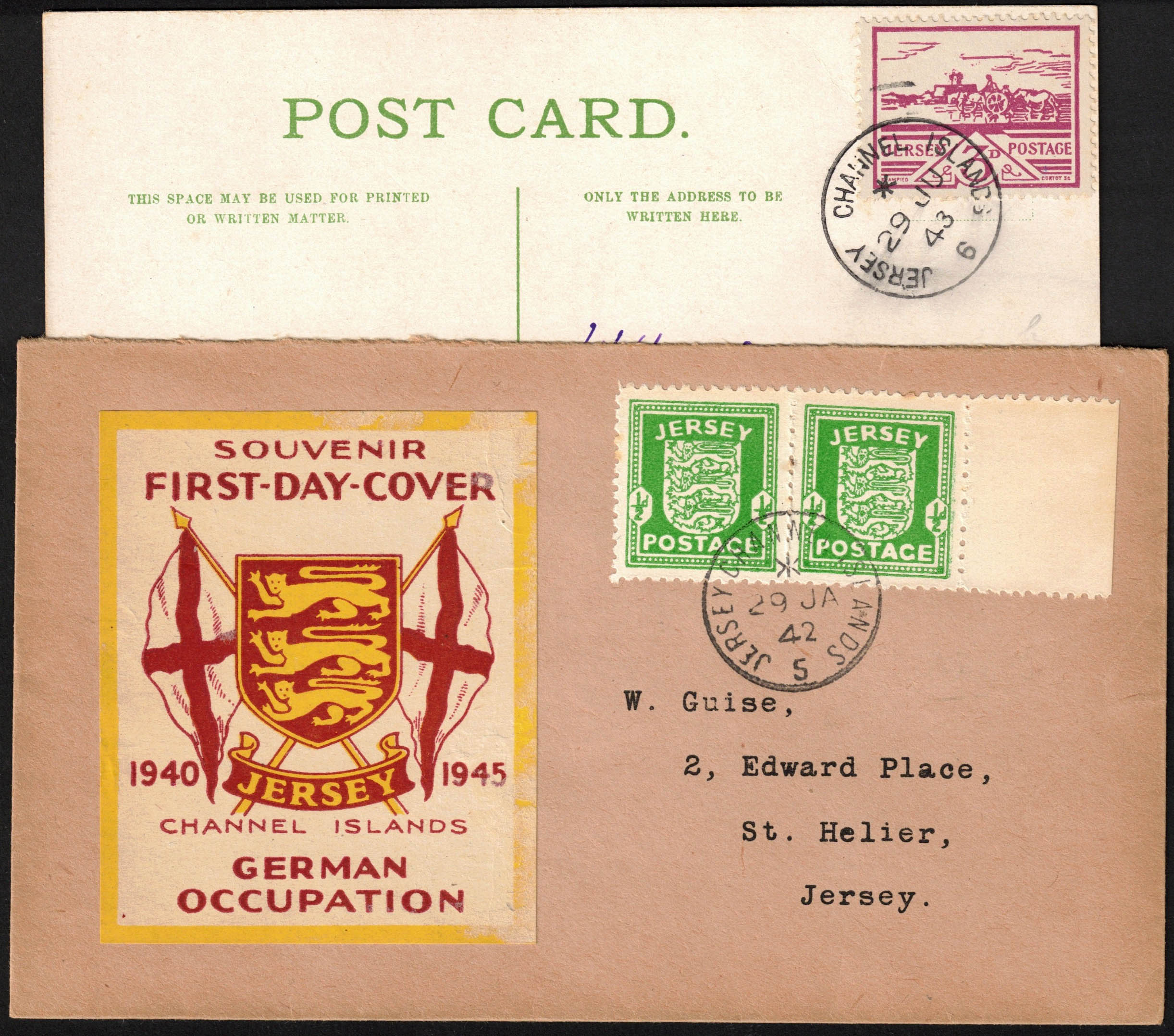 Jersey - 1942/3 - 13 documents (3 CP) avec affts Yv. 1 à 8. TB ensemble.