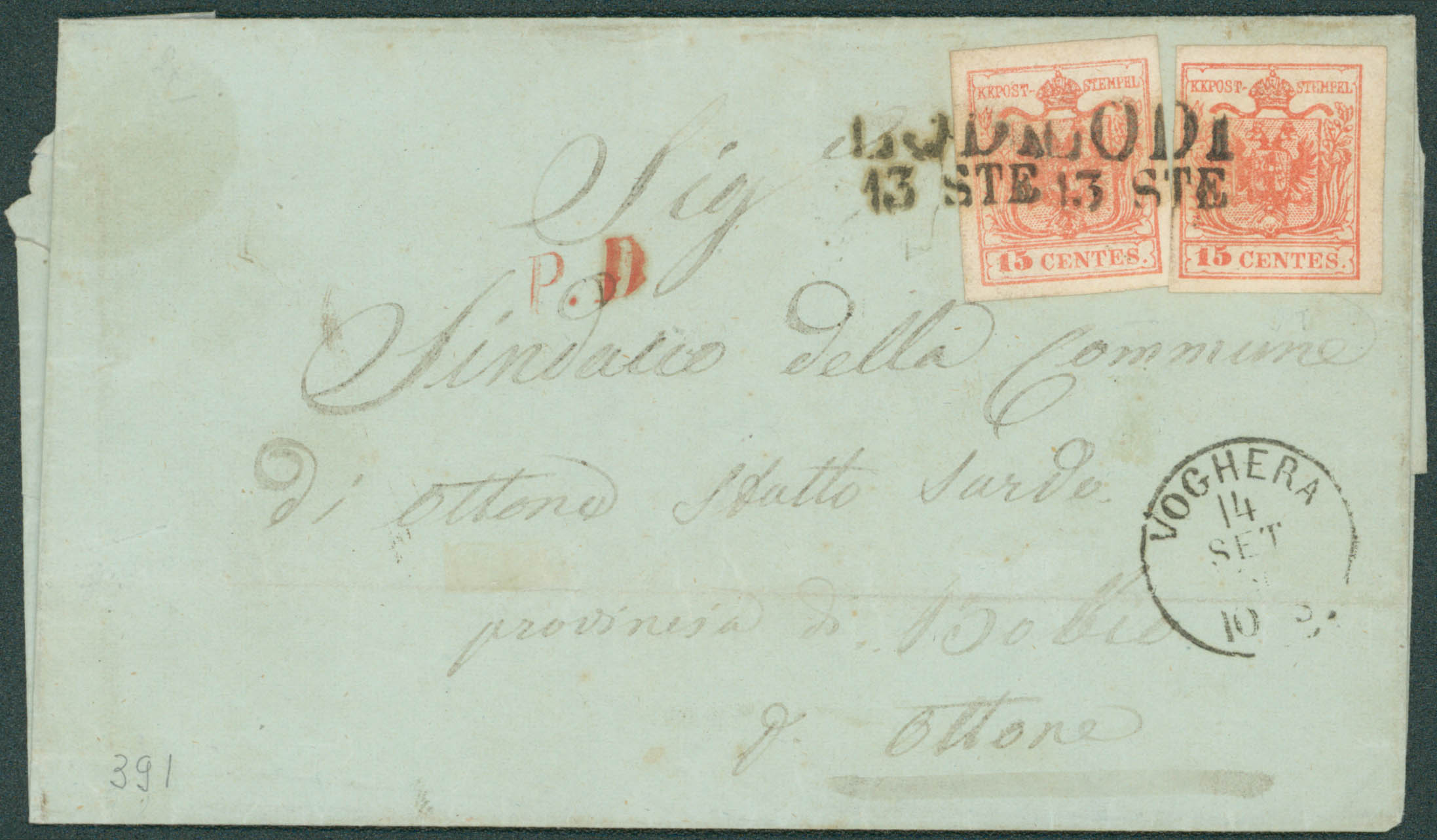 Lombardo-Vénétie - Yv. 3x2, margés, annulés par griffe Lodi + dateur 13/9, càd Voghera 14/9, sur LSC vers Ottone.