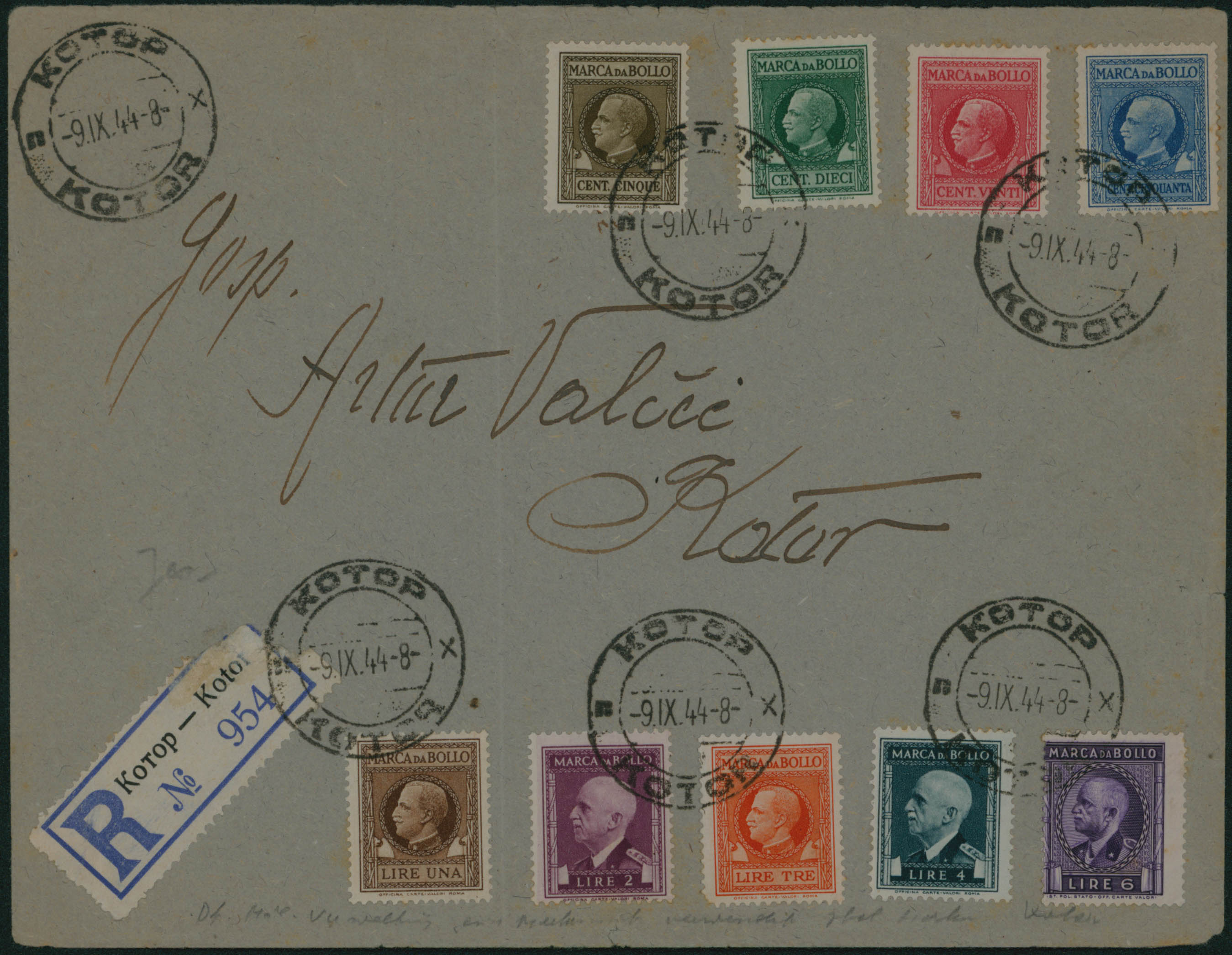 Monténégro - TB afft multicolore obl 9/9/44, 9 timbres fiscaux italiens, rec de et vers Kotor.