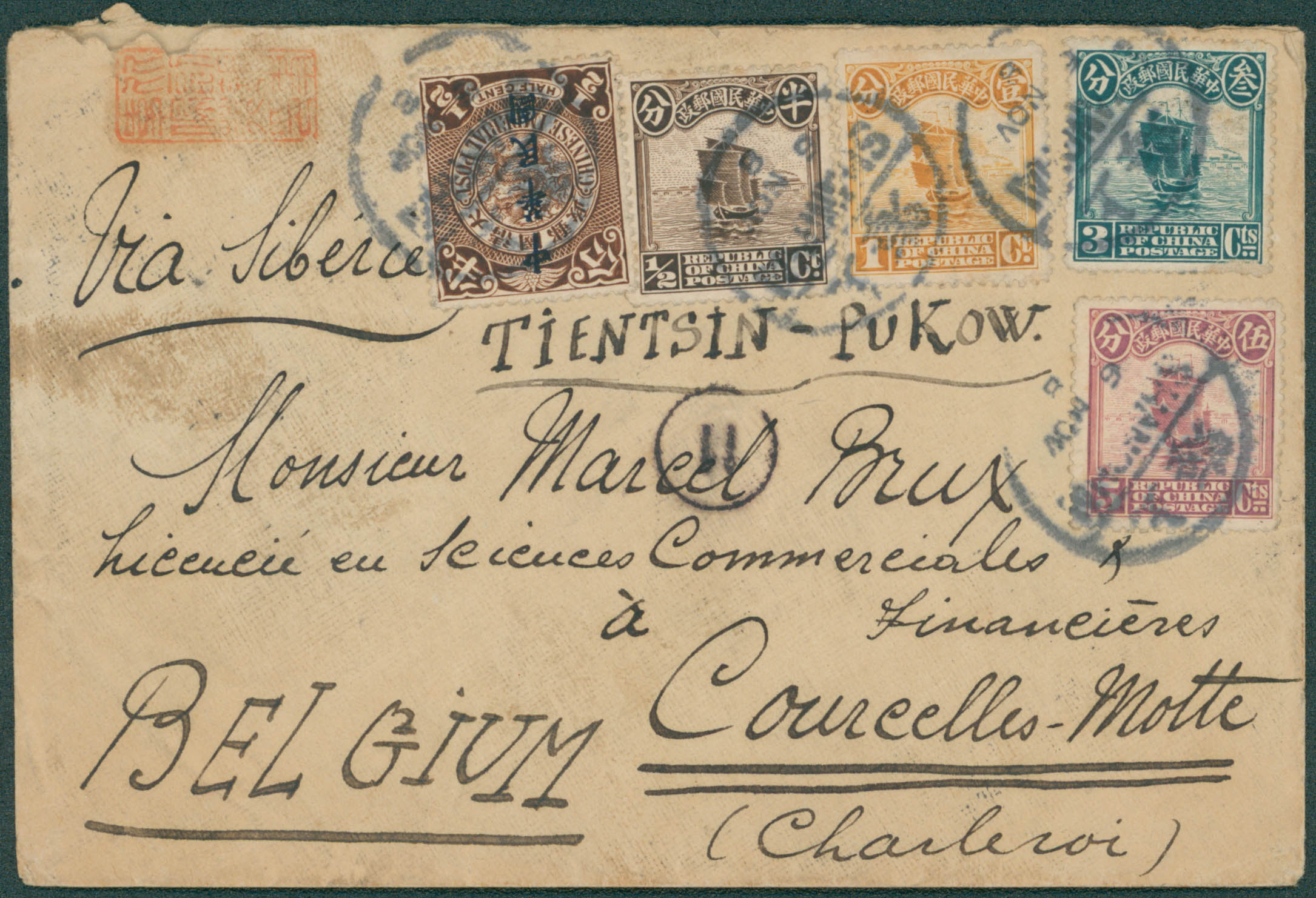 Afft mixte Yv. 83-145/6-148-151 obl Shanghaï 6/11 vers Courcelles en Belgique. Verso càd Tientsin, Moukden et arrivée + manuscrit 'C/o Belgian Consulate Shanghaï'. TB'