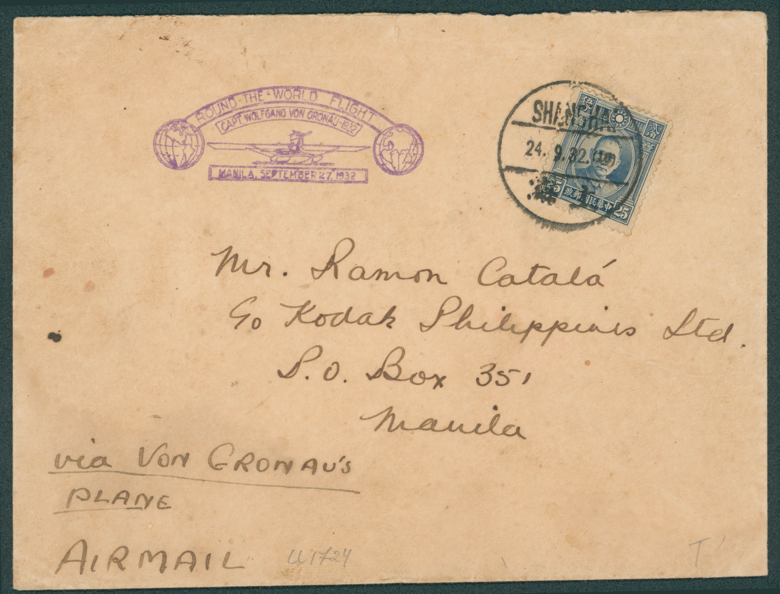 Yv. 226 obl Shanghaï 24/9/32 + cachet en violet 'Round the world flight - Capt. Wolfgang von Gronau 1932/Manilla september 27 1932' vers Manille, càd verso. Rare.'