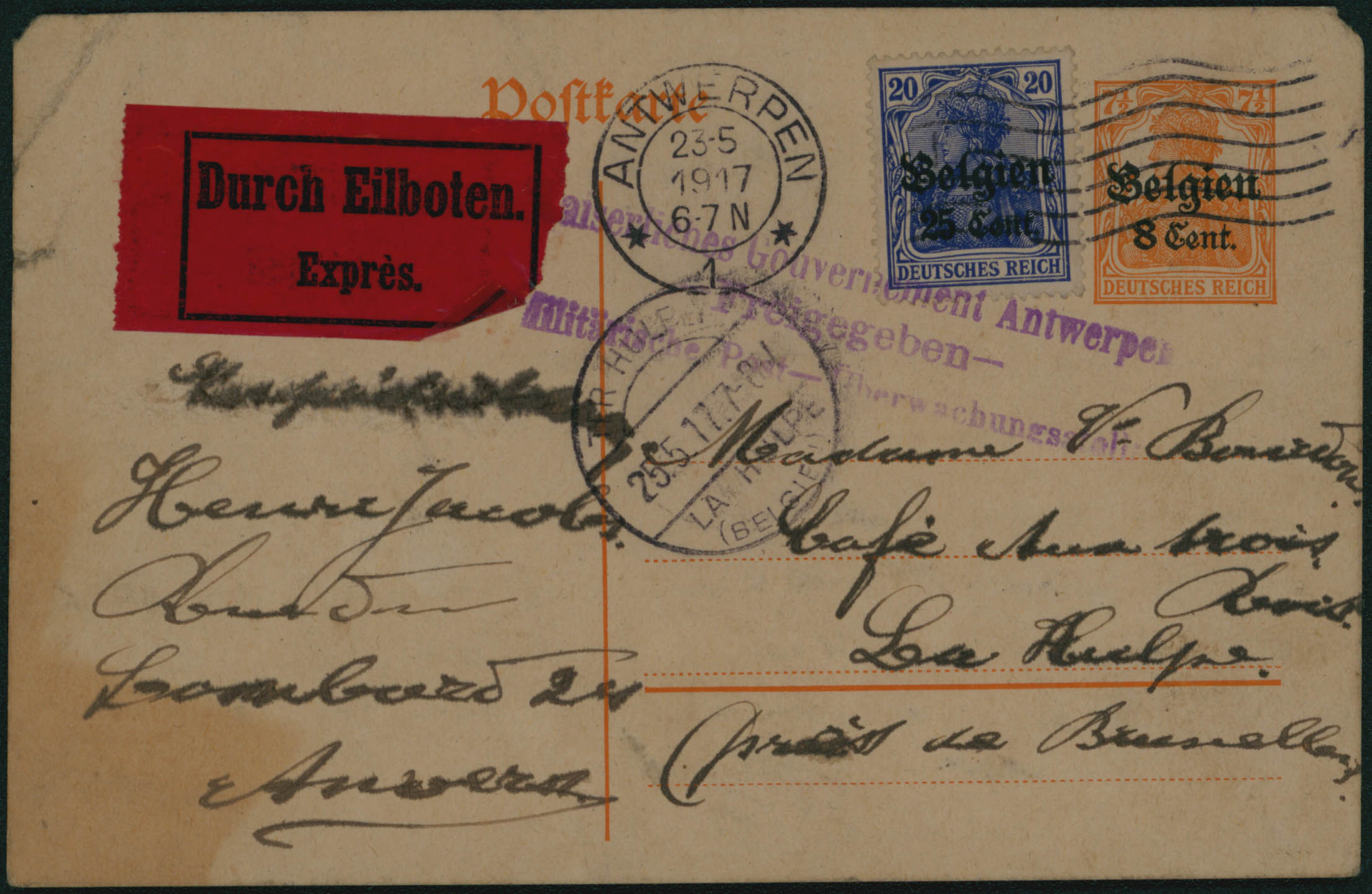 EP OC 8c + OC 18 obl Antwerpen 23/5/17 en expres vers La Hulpe. Censure d'Anvers. Texte au verso.