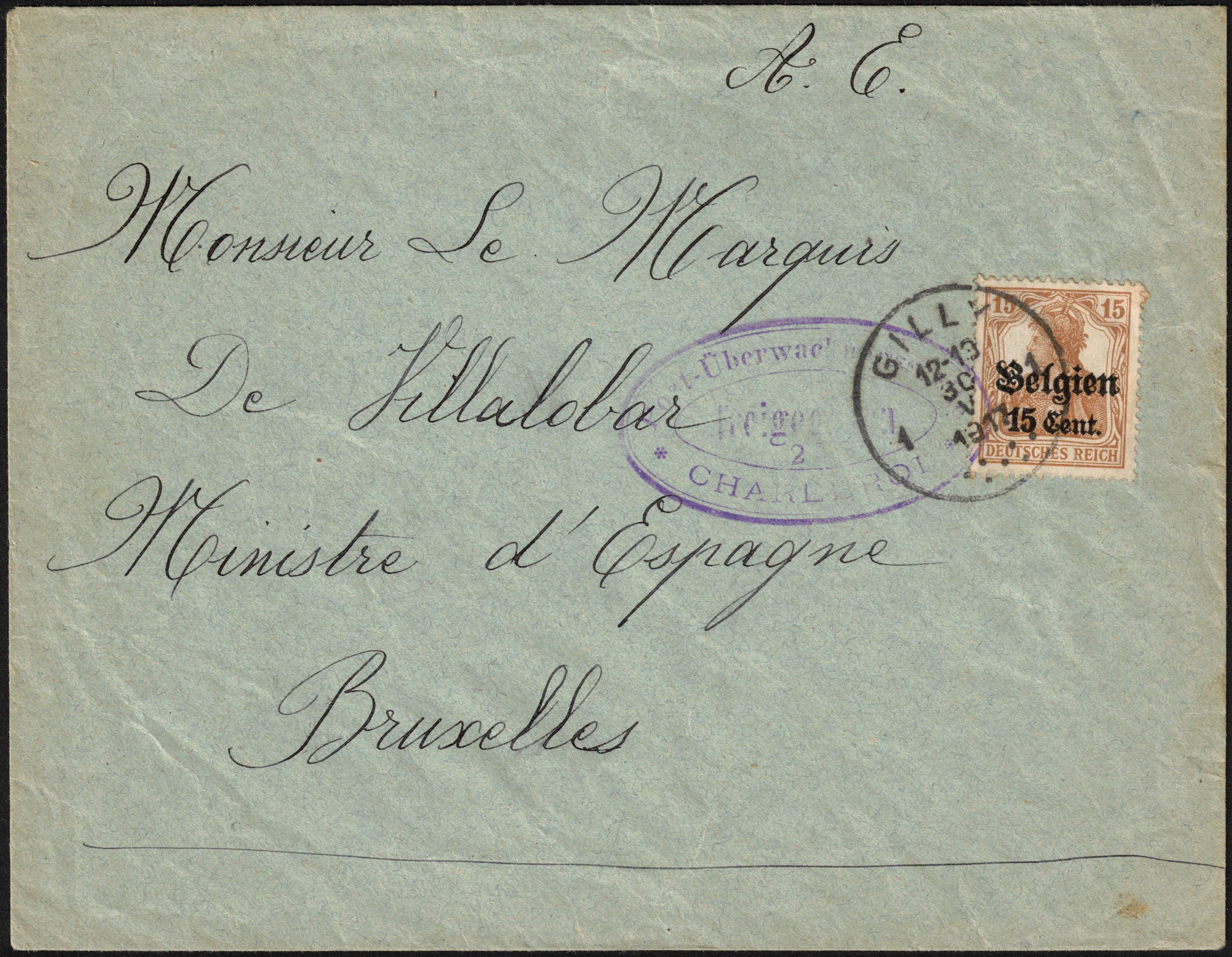 OC 15 obl Gilly 30/V/1917 vers Bruxelles, vers le Marquis de Villalobar, Ministre d'Espagne. Censure de Charleroi.