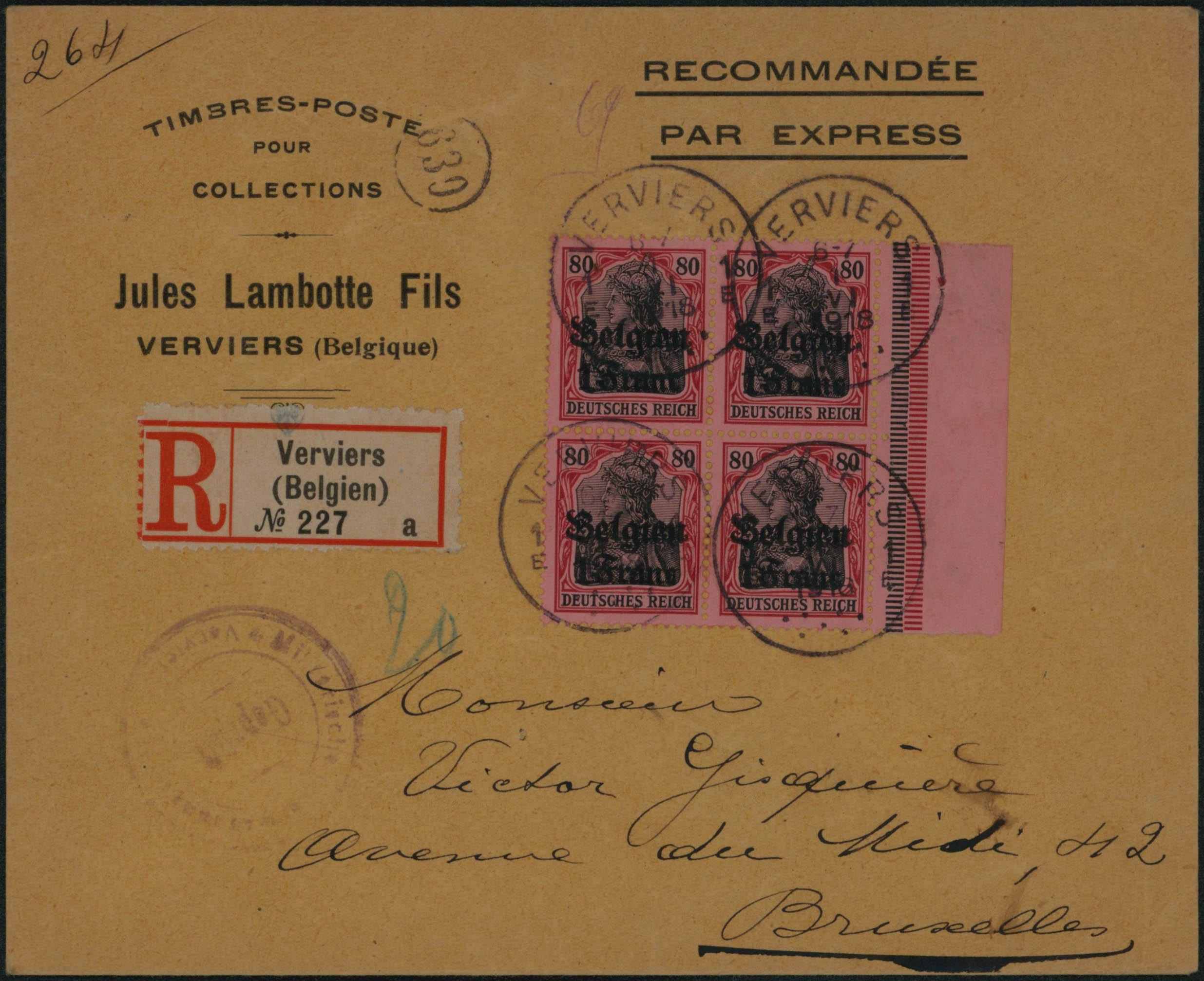 OC 22 en bloc de 4 bdf obl Verviers 1/6/1918 en expres rec vers Bruxelles, càd verso. Censure.