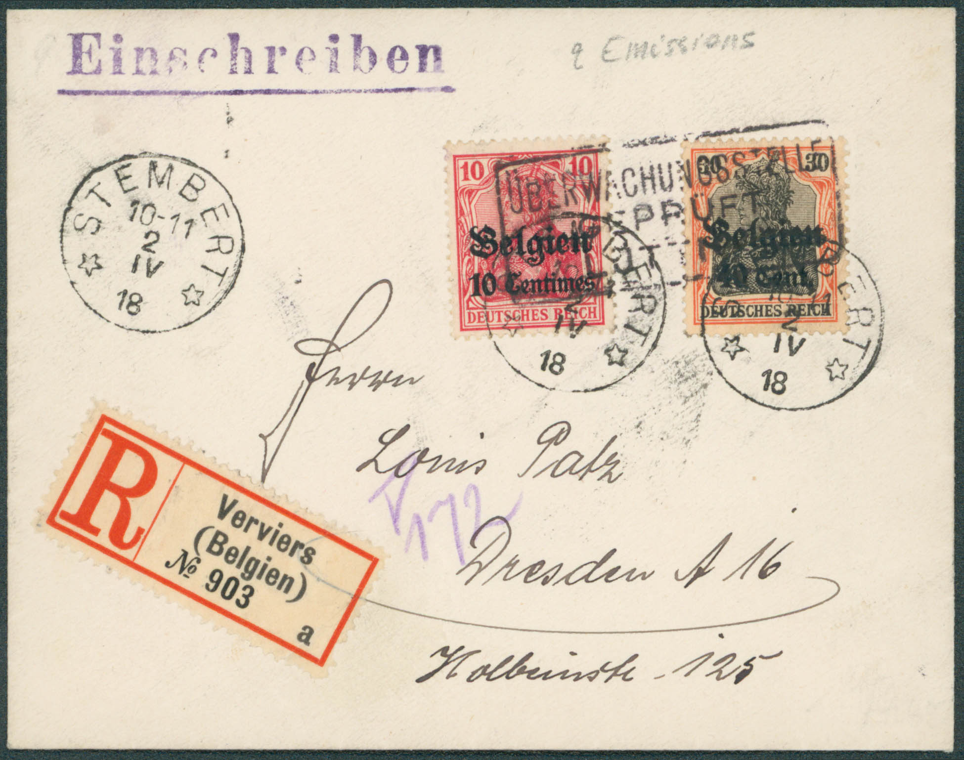 OC 3-19, afft mixte, obl relais Stembert 2/4/18 en rec vers Dresden, càd verso 7/4. Censure de Liège apposée sur les timbres.