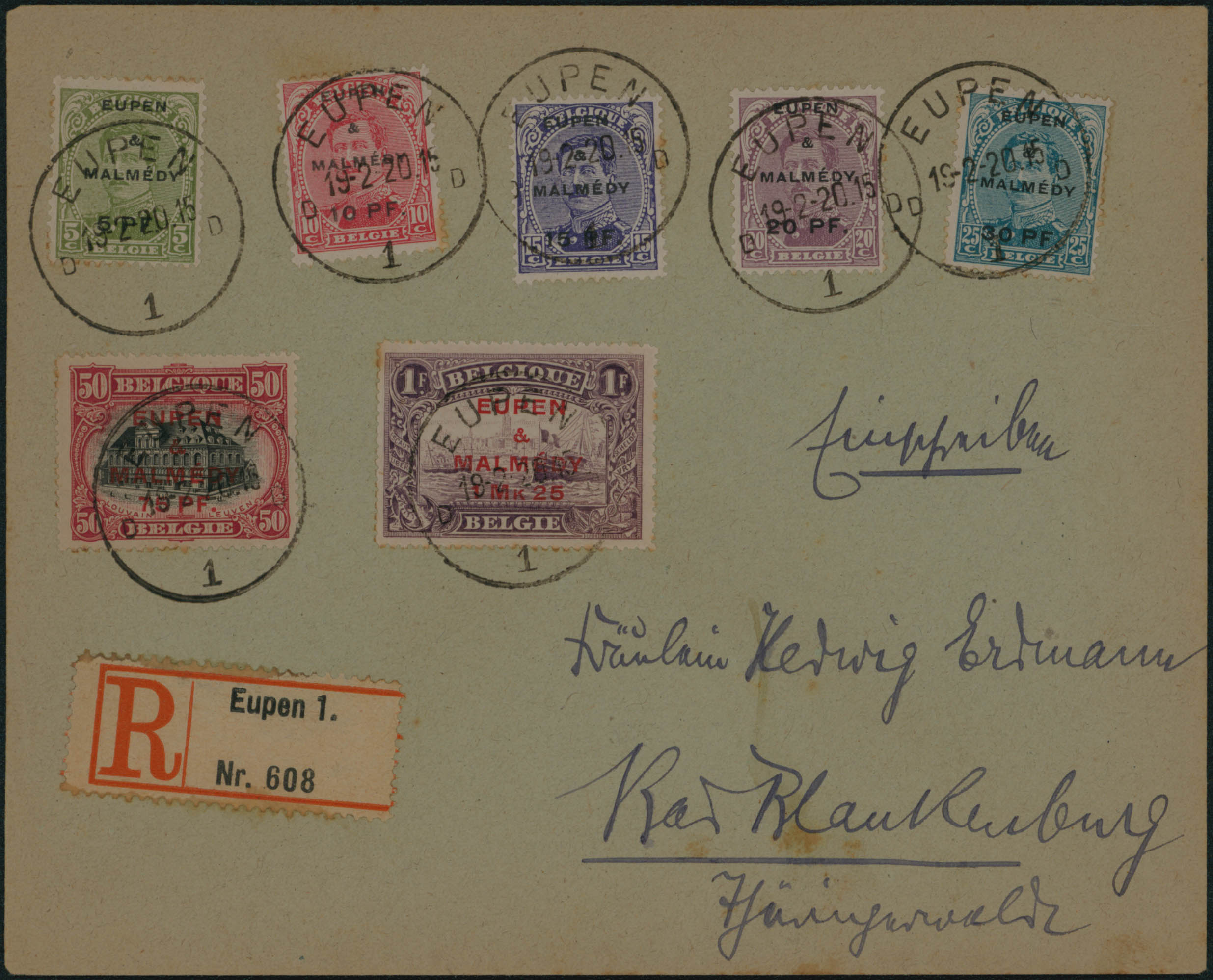 OC 55 à 61 (surchargés Eupen & Malmédy) obl Eupen du 19/2/20 en rec vers l'Allemagne, càde Bad Blankenburg 22/2/20 au verso.