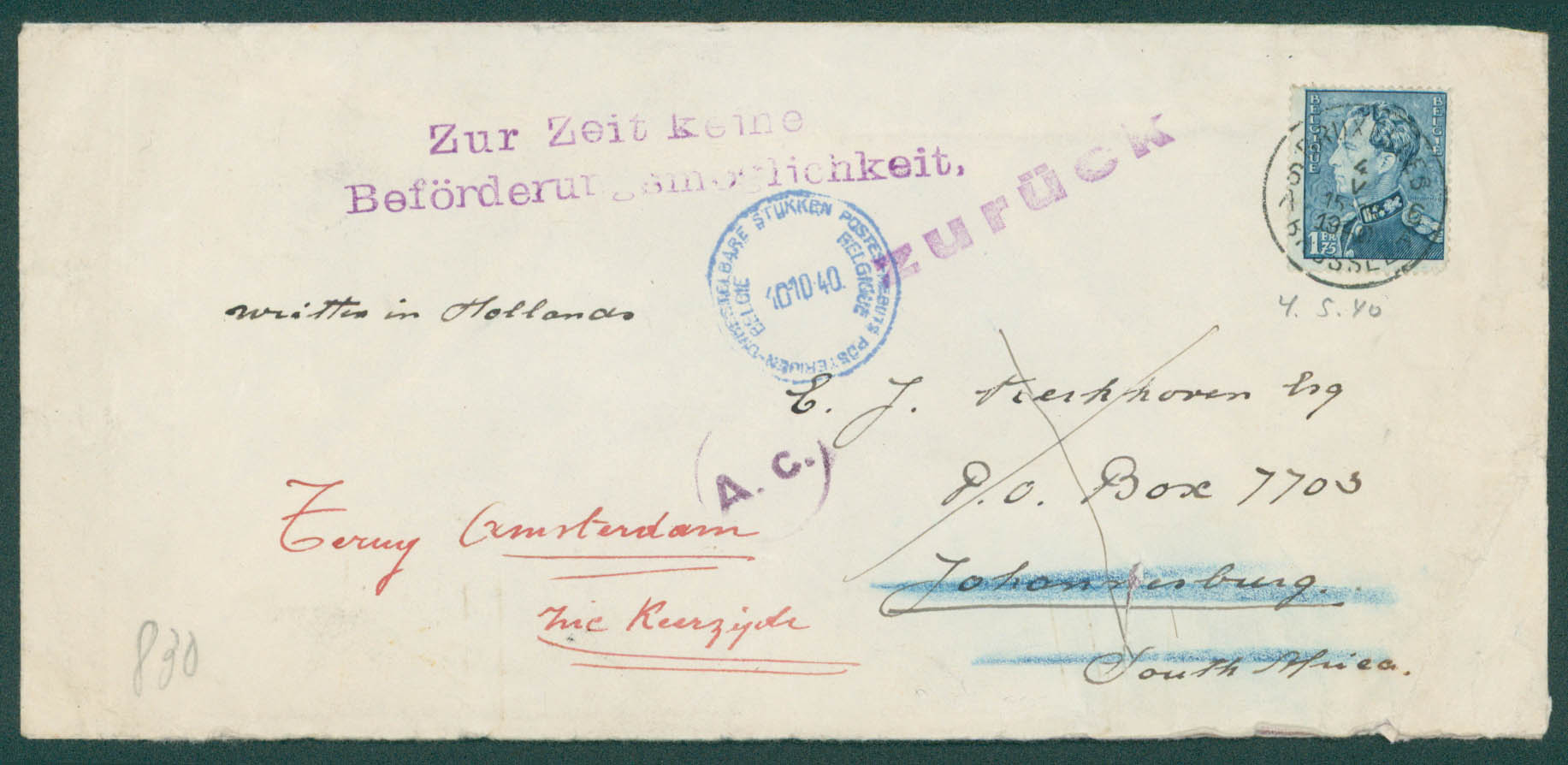 430 obl Bruxelles 4/5/1940 par bateau vers Johannesburg, Afrique du Sud. Refusé à la censure allemande de Frankfurt, griffe 'Zur zeit keine beförderungsmöglichkeit' + Zurück. Lettre parvenue au Service des Rebuts le 10/10/40 et réexpédiée après passage par la censure de Cologne vers Amsterdam ou se trouvait l'expéditeur. TB'