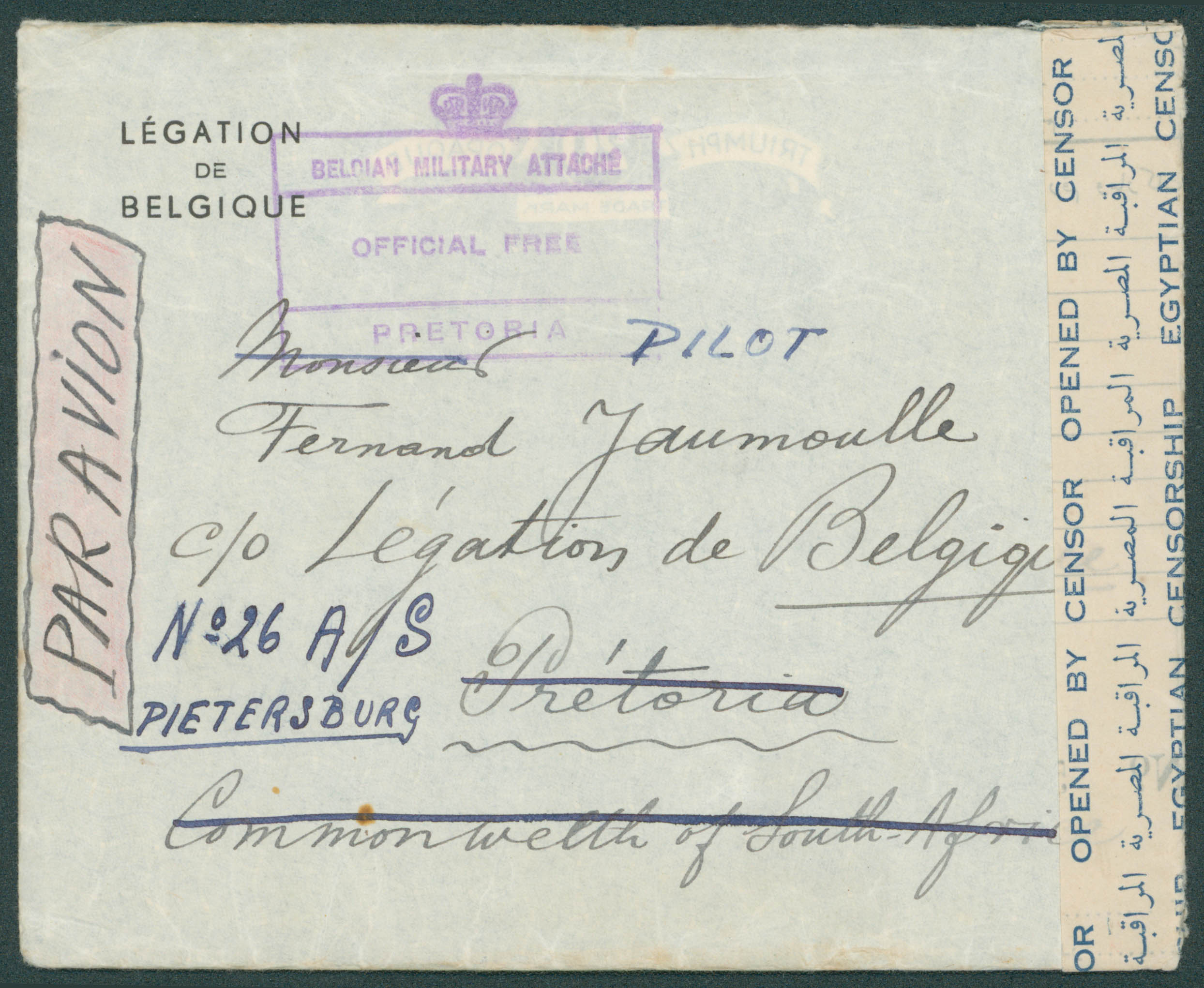 Enveloppe de la Légation de Belgique en Turquie, grand cachet au verso, intérieur daté 31/12/1942 Istambul en PA vers Prétoria, suivi Pietersburg, Afrique du Sud. Bande de censure égyptienne + 'Belgian Military Attaché/Official Free/Pretoria'. TB'