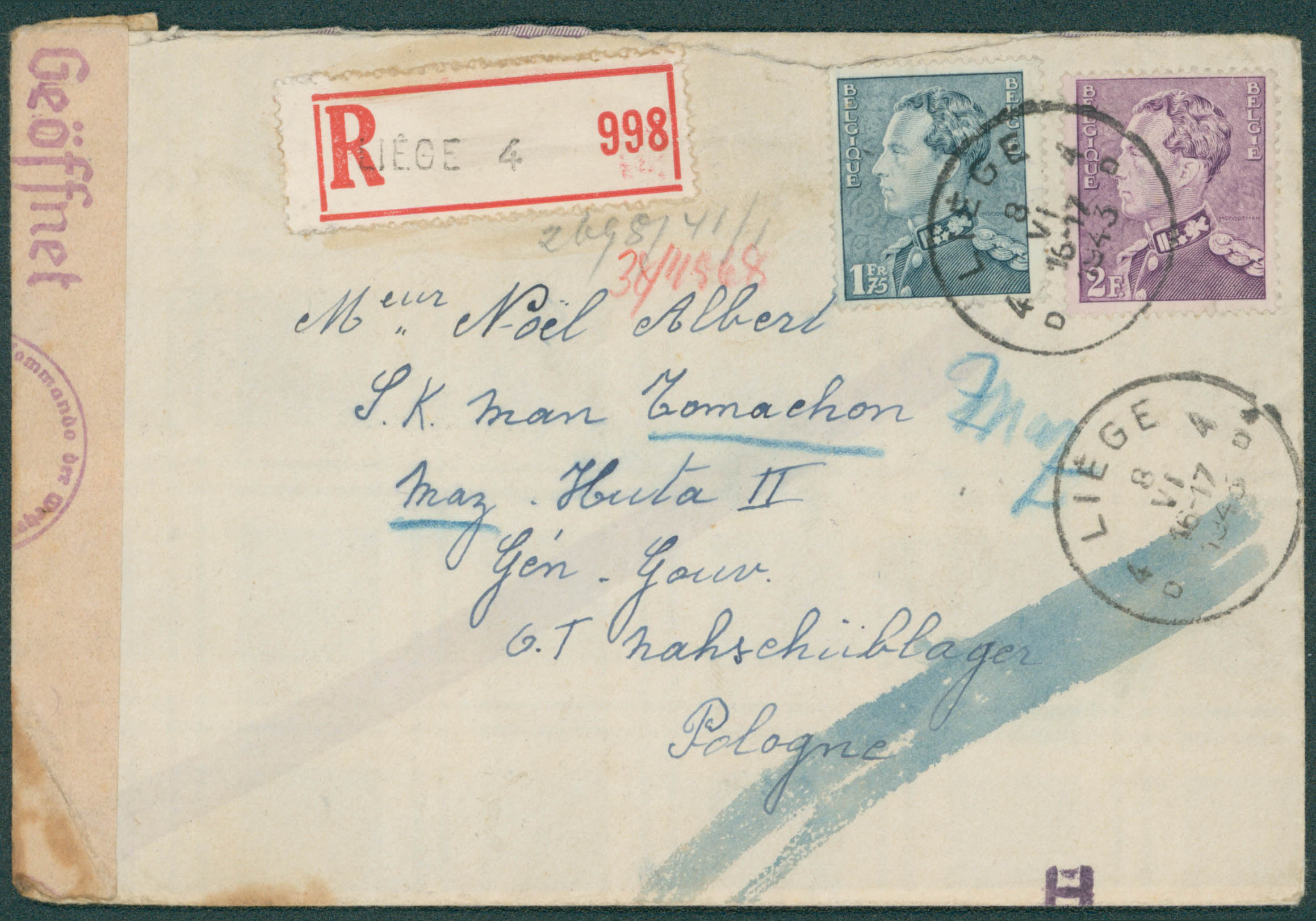 Collaboration - 430-431 obl Liège 4 du 8/6/1943 en rec vers S.K. Man Tomachen en Pologne. Censures allemandes. Càd arrivée verso.