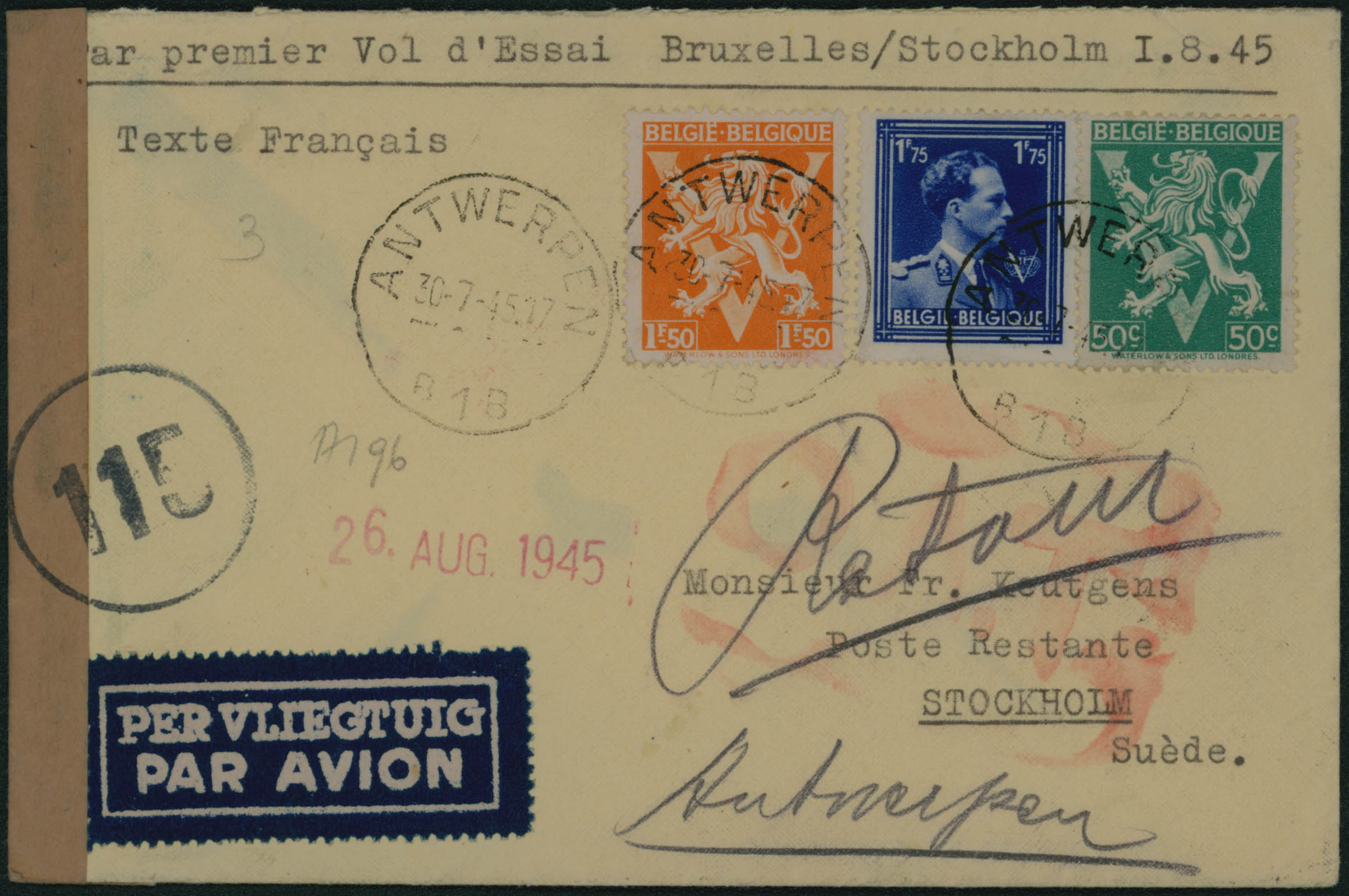 678A-682A-692 obl Antwerpen 30/7/47, 1er vol d'essai Bruxelles-Stockholm 1/8/45, vers la Suède. Encadré en rouge "O.A.T." Au verso : Non réclamé. Retour. Bande "Retour à l'expéditeur par l'intermédiaire du Contrôle des Communications pour les raisons mentionnées.." + "115"."
