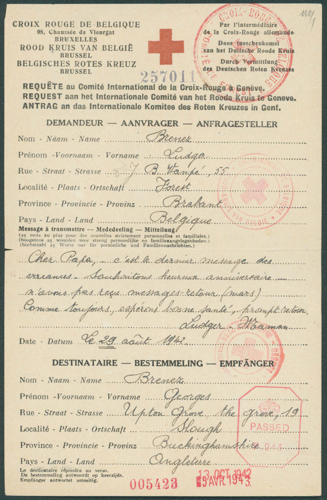 Archive familiale, lot de requêtes au Comité International de la Croix-Rouge à Genève, plus de 90 pièces entre 1942 et 1944 de Belgique vers l'Angleterre, cachets Croix-Rouge et censures anglaises + 5 CR bureau de recherches civils. Bel ensemble, à voir.