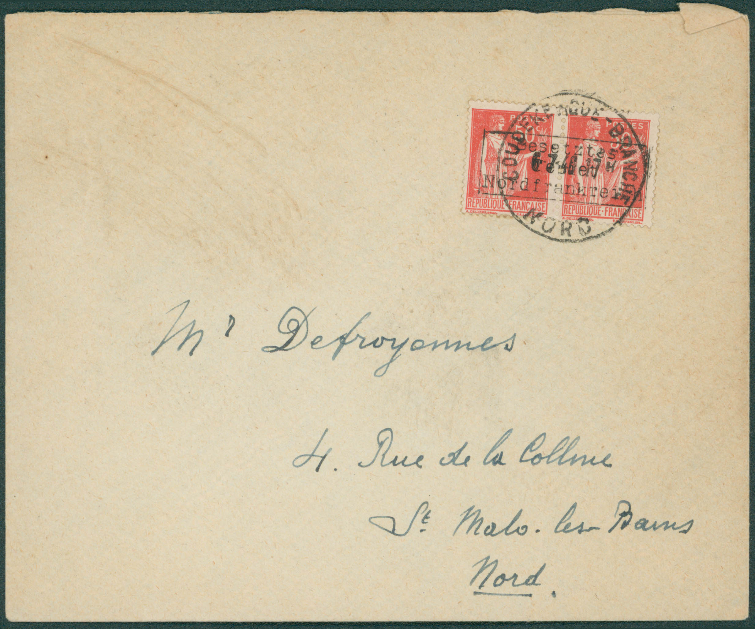 Timbres de guerre Yv. 6 en paire (surchargés Besetzes Gebiet Nordfrankreich) obl Coudekerque-Branche 6/7/40 vers St Malo-les-Bains. Cote 1300?.