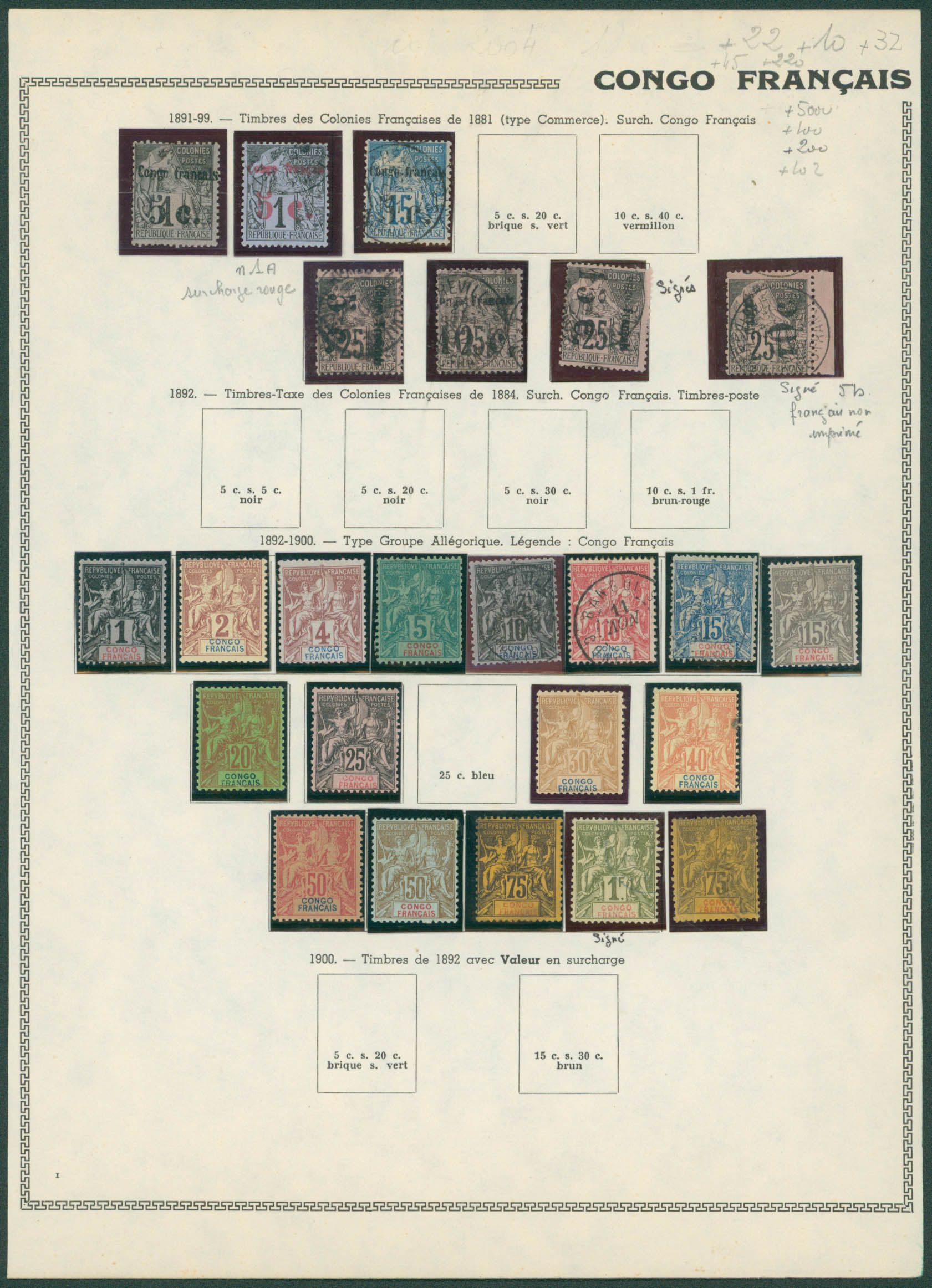 Congo français - collection obl/X/XX entre 1891 et 1933 dont 2 obl signé, 5b bdf obl signé, colis postaux 1 signé, 2 XX signé Calves.. TB ensemble.