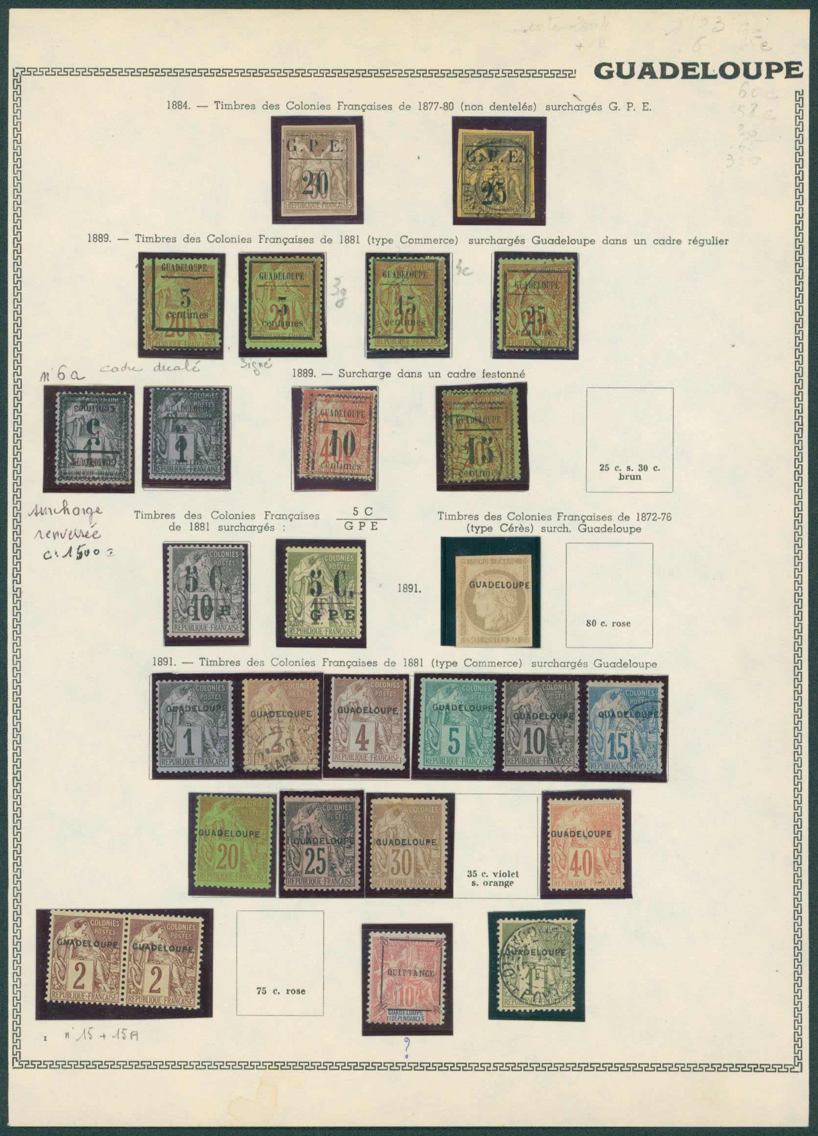 Guadeloupe - Collection obl/X/XX entre 1884 et 1947 dont plusieurs variétés et postes annexes. Forte cote, très bel ensemble.
