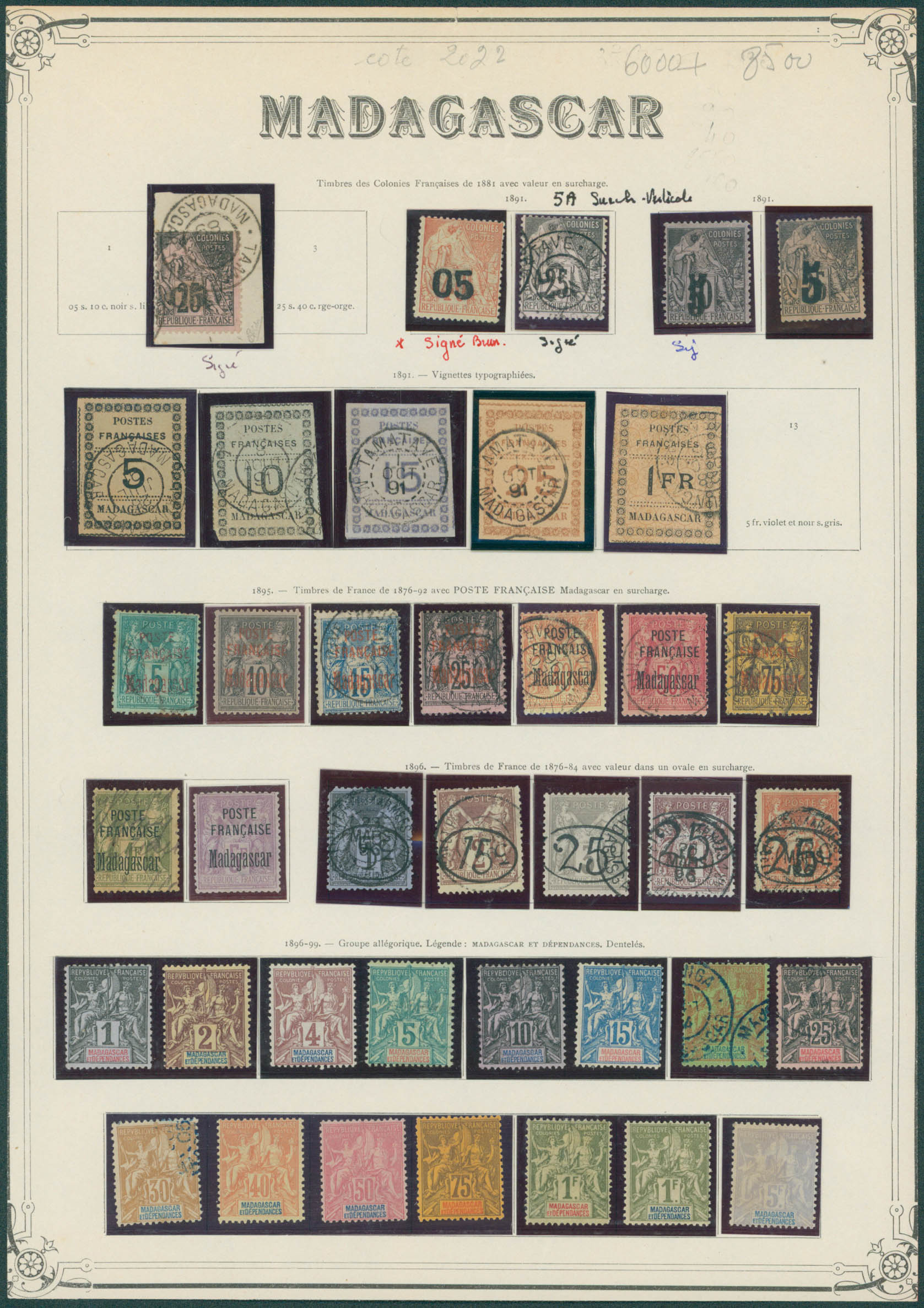 Madagascar - Collection obl/X/XX entre 1889 et 1954 dont 3 et 6 X signés Brun, 63/77 ND signé Brun, variétés, postes annexes dont Colis Postaux 1/5 X. Forte cote.
