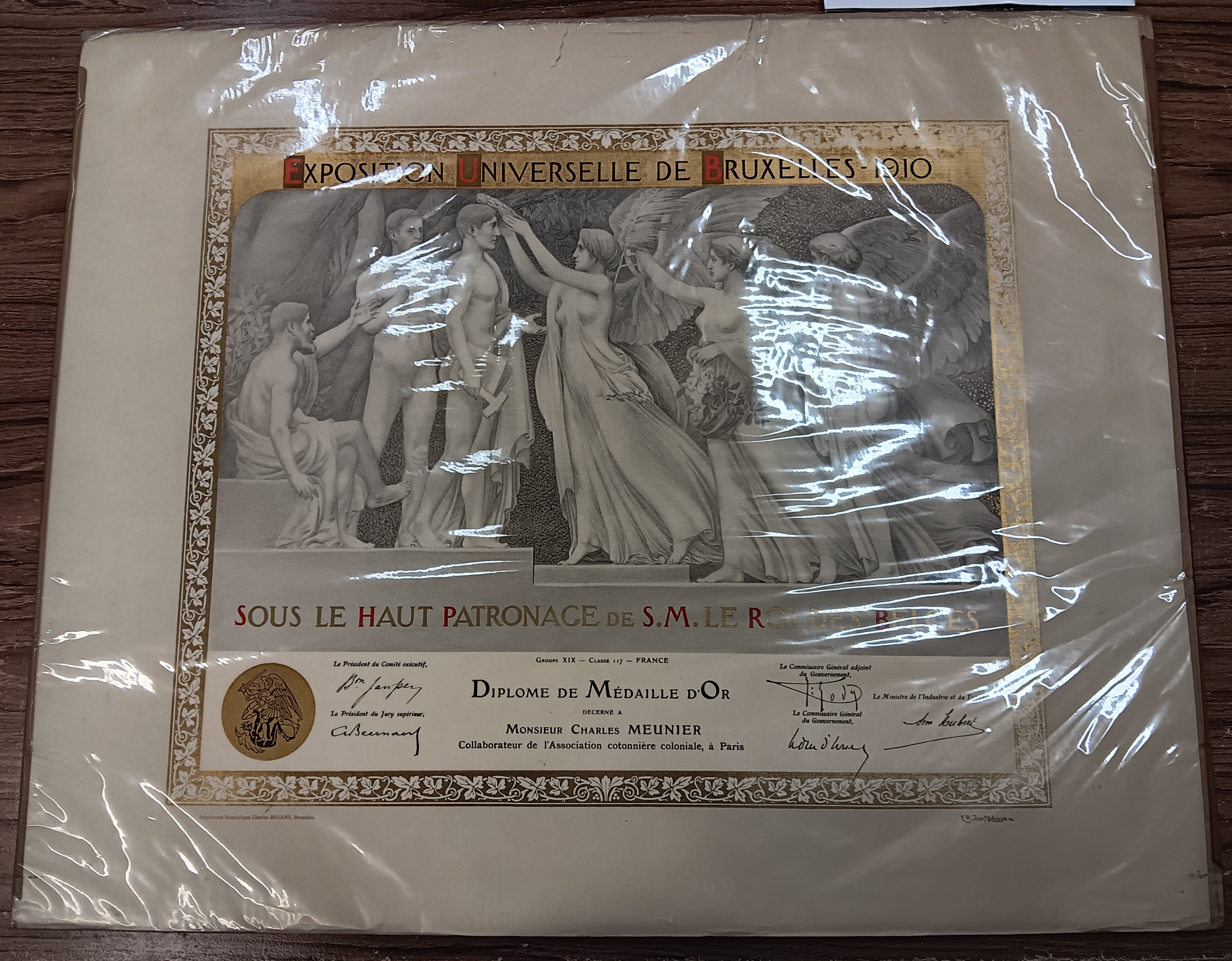 Exposition Universelle de Bruxelles 1910 - Diplôme de Médaille d'Or, groupe XIX, France. Polychrome, illustré grand format 75x61 cm. Pétits défauts sinon rare.