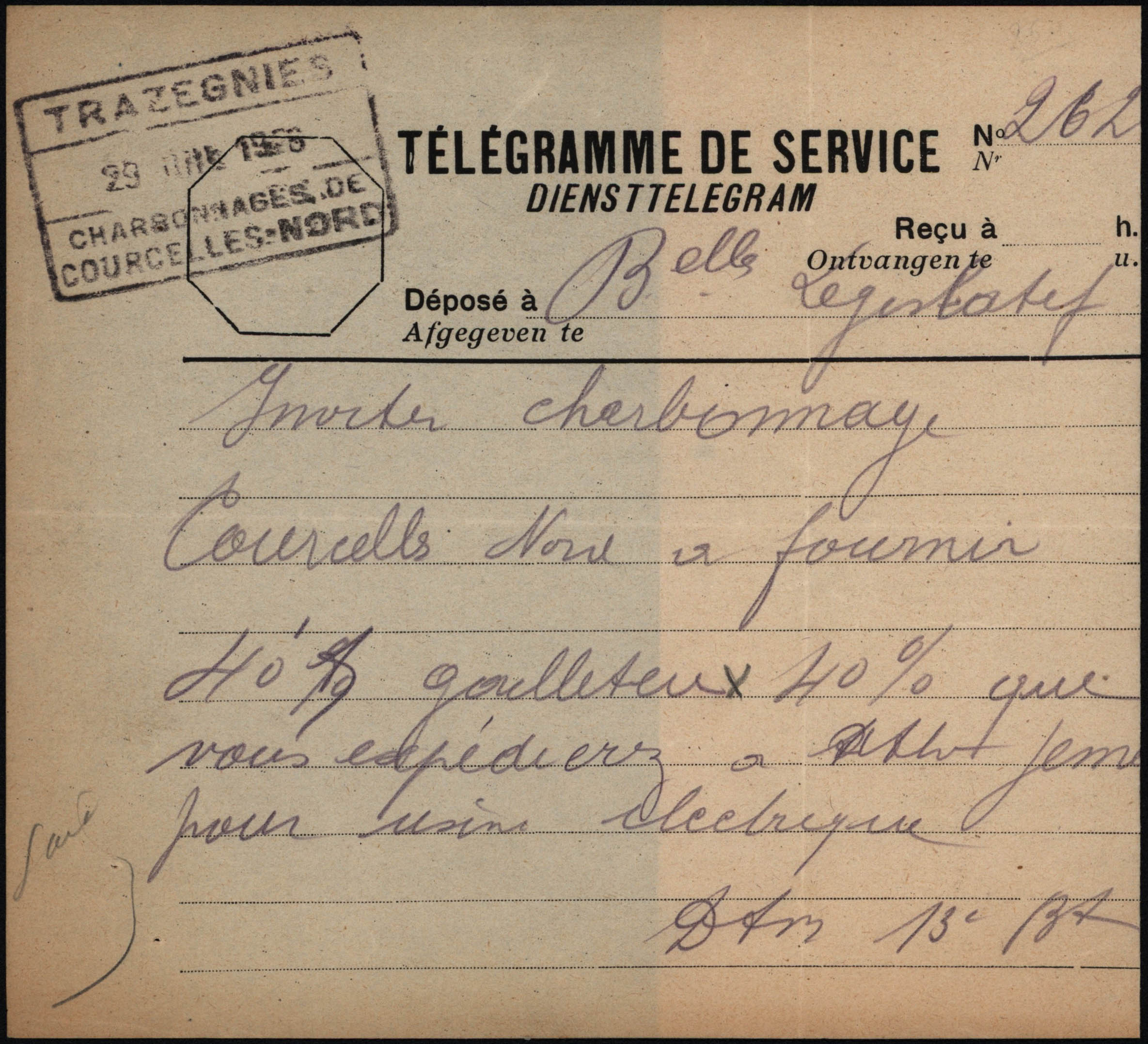 Télégramme de service Bruxelles 1926 vers la gare privée de Trazegnies, charbonnages de Courcelles-Nord. TB