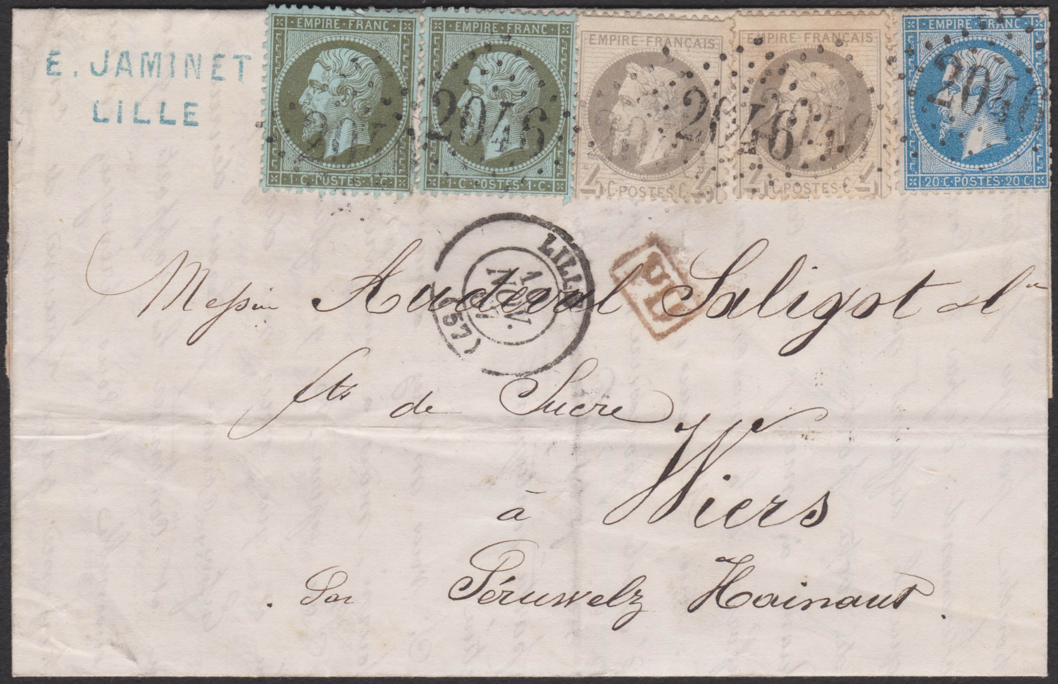 Yv. 25x2-27x2-29 obl GC 2046 + càd Lille 10/11/1867, PD en rouge, LAC vers Wiers. Verso : France/Midi I et arrivée Péruwelz le 11/11.