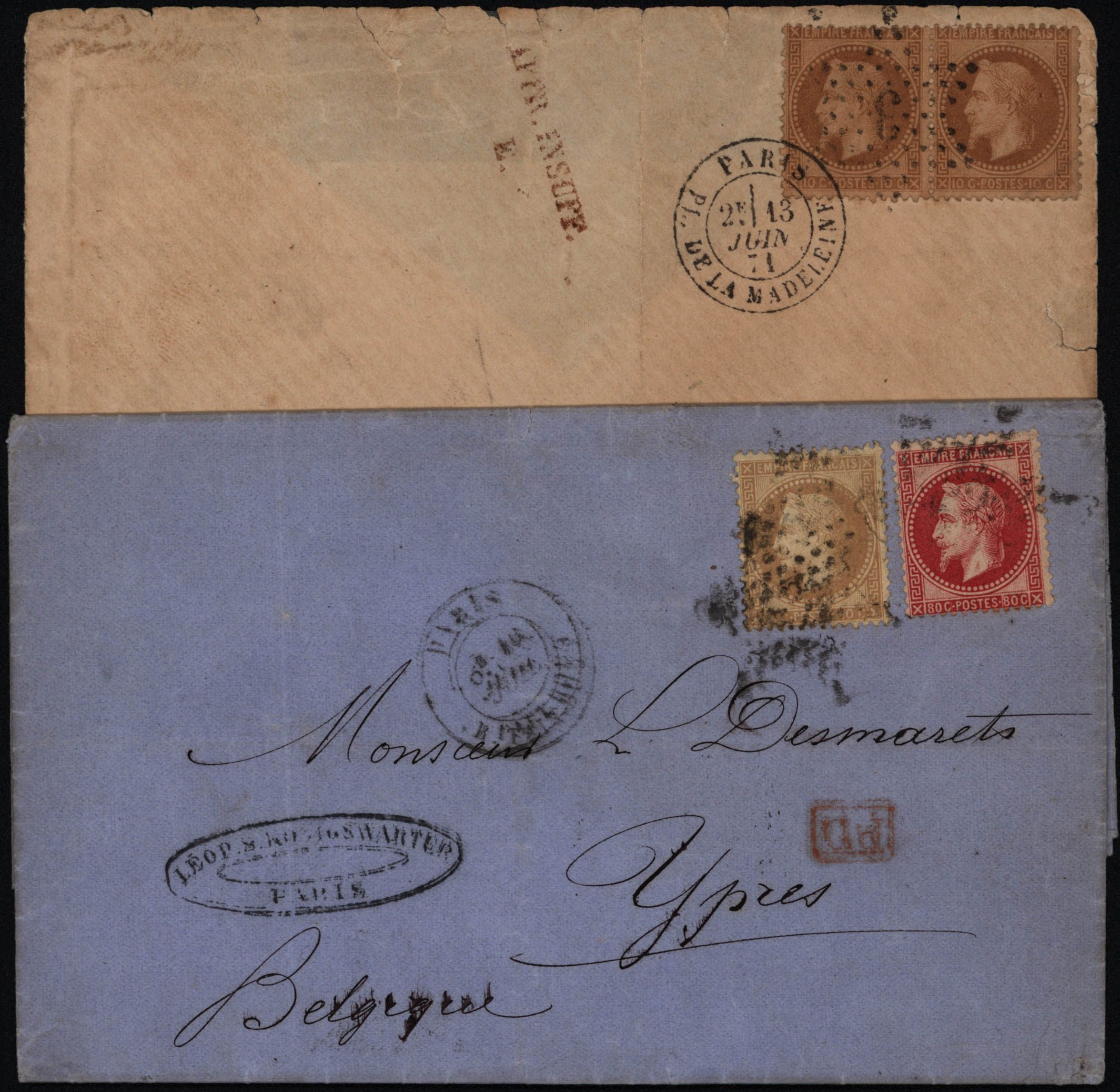 Yv. 28-32 obl étoile + càd Paris 16/7/69 sur LAC vers Ypres en double port, au verso France/Ouest 17/7 et arrivée et Yv. 28B en paire obl étoile 3 + càd Paris (Pl de la Madeleine) 13/6/1871 sur env vers Liège. En rouge 'Affr. Insuff.' et taxation 3 décimes.'